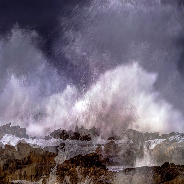 Layered photographic slow-shutter speed images reveals luminous hues and flowing movement at dawn, drawing the eye to its depth and mystery of rare blues. These layered images were captured at dawn at Kwaaiwater, Hermanus, and tell the story of the power of the ocean meeting solid rocks.